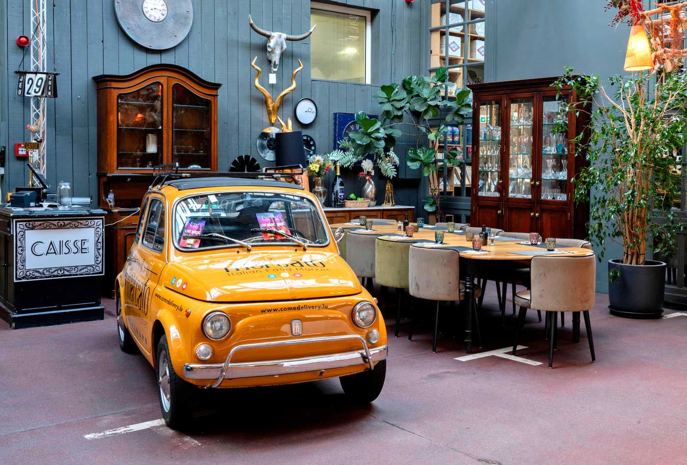 Das Inventar vollständig aufzulisten, wäre eine Mammutaufgabe: Da ist ein gelber Fiat 500 aus den 1970er-Jahren mit der Aufschrift Mercato, einer weiteren Gastro-Marke des Inhabers. Gegenüber erinnern zwei Vespas an seine kalabrischen Wurzeln. Skulpturen aus Treibholz, die von einem nach Marokko ausgewanderten Freund entworfen wurden, fallen ebenso ins Auge wie ein aufgehängtes Boot. „Antiquitäten sind meine Leidenschaft. Ich bin zeitweilig gerne nach Osteuropa, nach Polen, Rumänien, Tschechien gereist.“ Und so trennt eine bezaubernde rumänische Ladenfront aus dem 19. Jahrhundert den Selbstbedienungs- vom Eingangsbereich.