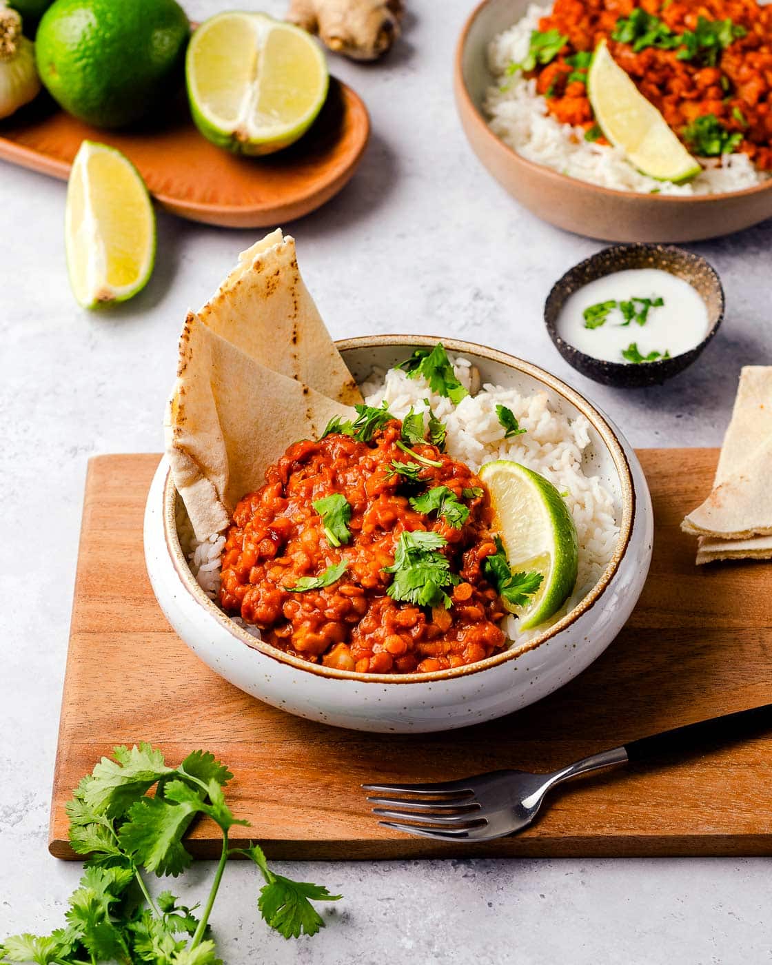 - Den Dahl mit dem Reis, der Kokossauce und einer frischen Limettenspalte servieren.