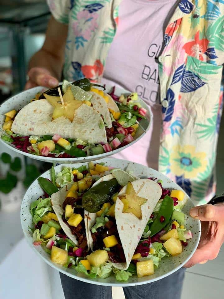 Nun zum Hauptgang, und wieder einmal bin ich begeistert von der Präsentation des Gerichts! Als jemand, der genauso viel Wert auf die Optik wie auf den Geschmack legt, komme ich voll und ganz auf meine Kosten. Zwei Weizentortillas mit schwarzen Bohnen und geräucherter Jackfruit, begleitet von einer Mango-Salsa. Köstlich und sehr deftig!