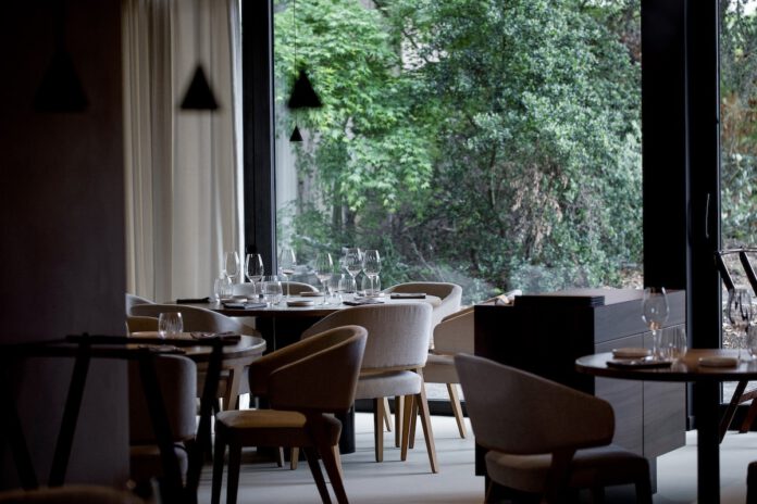 Es regnet an dem Tag, als wir ankommen, doch drinnen erwartet uns alles andere als Tristesse. Vor dem Gebäude, dessen Fassade die Initialen AB zieren, führt ein blumenreicher Weg an mit Vogesenholz verkleideten Gebäuden entlang zum Eingang auf der Rückseite des Restaurants. Ein majestätischer, hundertjähriger Zedernbaum und Wildblumen heißen uns willkommen. Durch die großen Panoramafenster erblicken wir das moderne und einladende Innere des Restaurants, gestaltet in Beige-, Grau- und Holztönen.