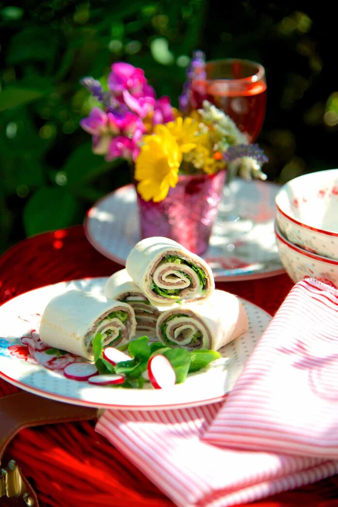 2. Die Tortillas mit den Rindfleischscheiben und dann mit dem Feldsalat belegen. Straff aufrollen und halbieren. Bis zum Servieren kühl stellen.