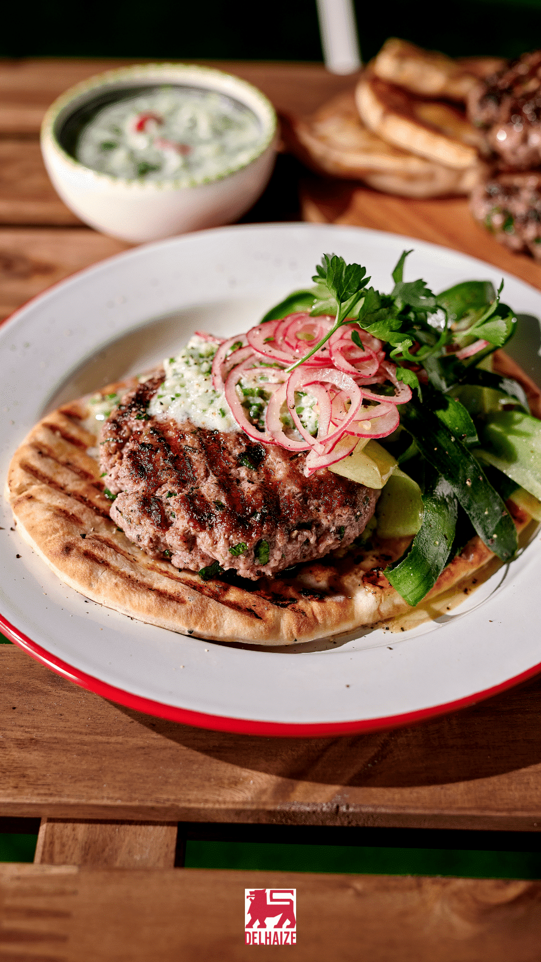 - Grillen Sie die Naan-Brötchen schnell auf dem Grill. Die Brötchen mit den Burgern und etwas Sauce belegen und mit den dünn geschnittenen roten Zwiebeln und der glatten Petersilie bestreuen, falls noch welche übrig sind.