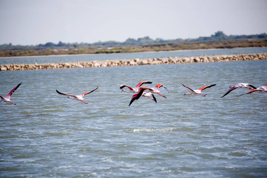 „Das Salz war schon vor uns Menschen da“, gibt Berater Luc Vernhes, ein pensionierter Salzbauer der Groupe Salins, zu bedenken. „Um Salz zu gewinnen, wird eine riesige Landfläche benötigt. Rund 100 Becken (auf 50 km) müssen eingerichtet werden. Heute neue Salinen anzulegen, wäre heute aufgrund von Platzmangel nicht mehr möglich“, erklärt er. Die Salinen erstrecken sich heute auf über 8000 m², eine Fläche, die dem Stadtgebiet von Paris entspricht. 40.000 Flamingos haben hier ihren Lebensraum. In der Ferne lassen Sie sich beobachten, wie sie, mit dem Kopf im Wasser, nach winzigen Garnelen fischen.