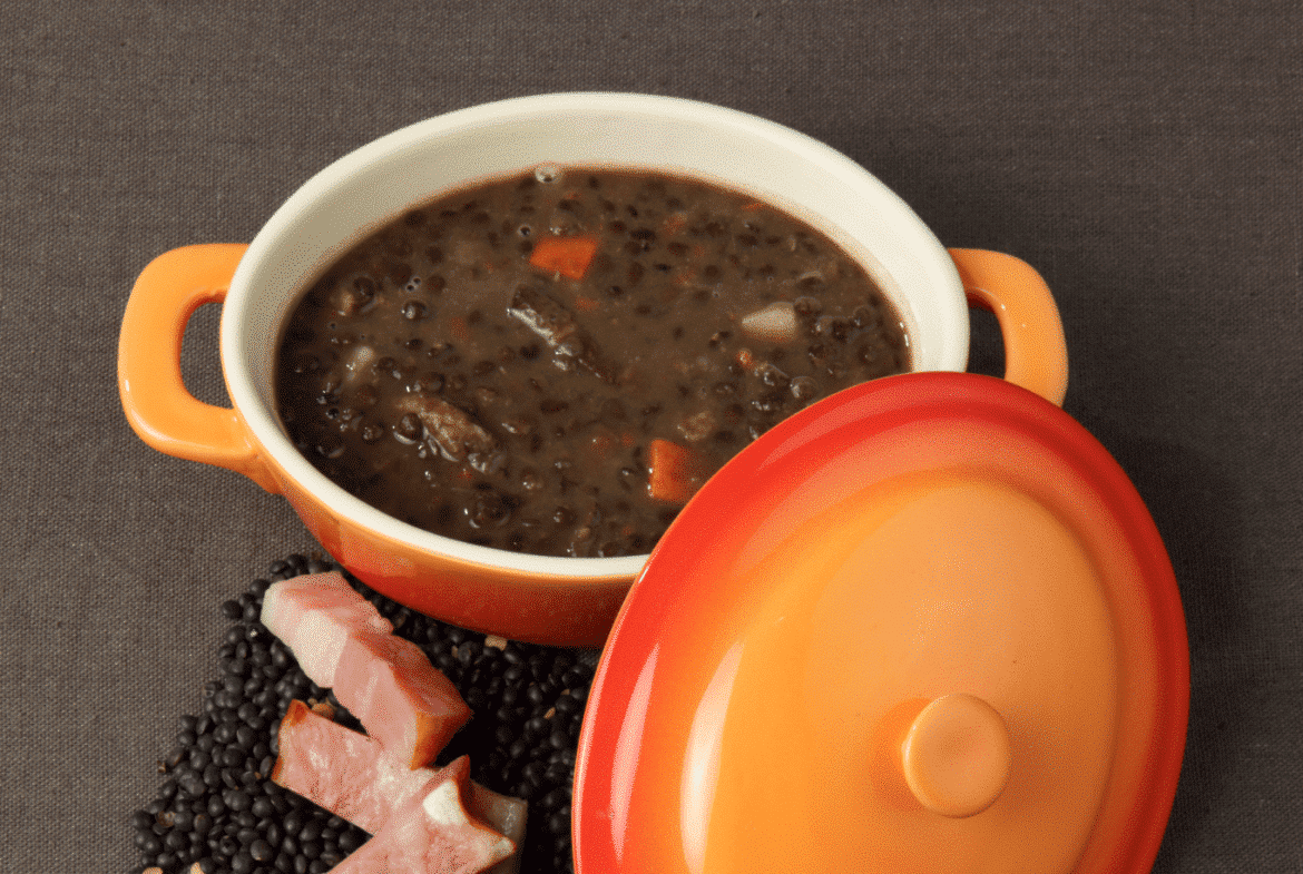 - A la fin de la cuisson, assaisonner délicatement la soupe de lentilles avec du sel et du poivre (à peine du sel, car la soupe est déjà salée par le lard et les saucisses de viande) et affiner avec un peu de crème ou de vinaigre selon les goûts. Servir le lard et les Mettwürst sur une assiette séparée.