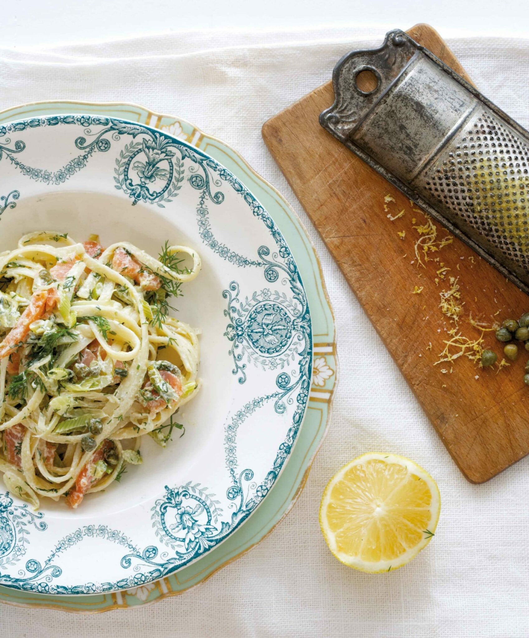 3. Faire cuire les pâtes dans une grande casserole d'eau bouillante salée jusqu'à ce qu'elles soient al dente. Egoutter et mélanger les oignons nouveaux avec la crème fraîche, les asperges et le saumon fumé avec les pâtes. Servir immédiatement.