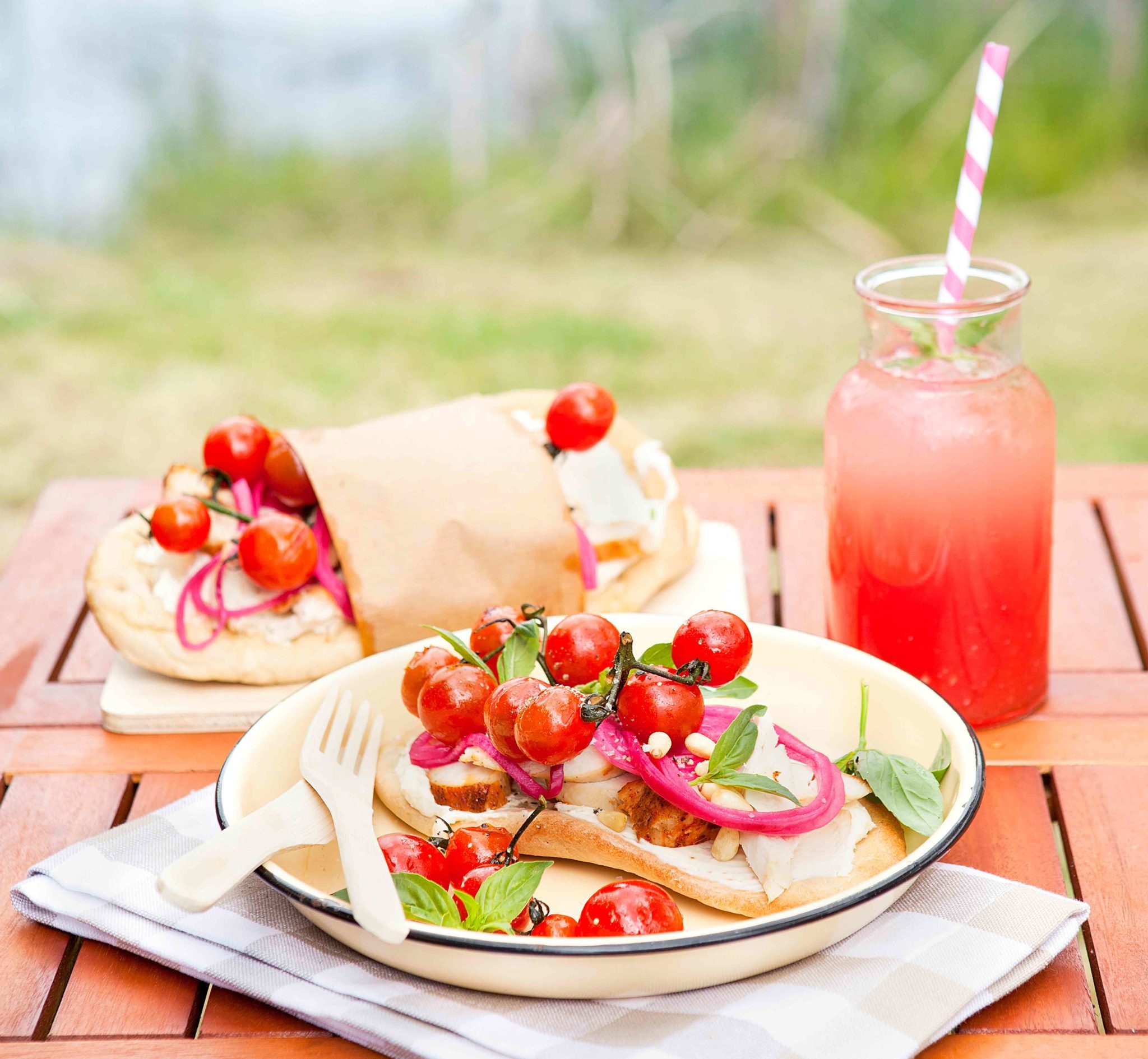 5. Pour assembler, étaler le fromage à la crème sur le pain ouvert, puis couvrir de poulet, d'oignons, de tomates, de pignons de pin et de basilic.