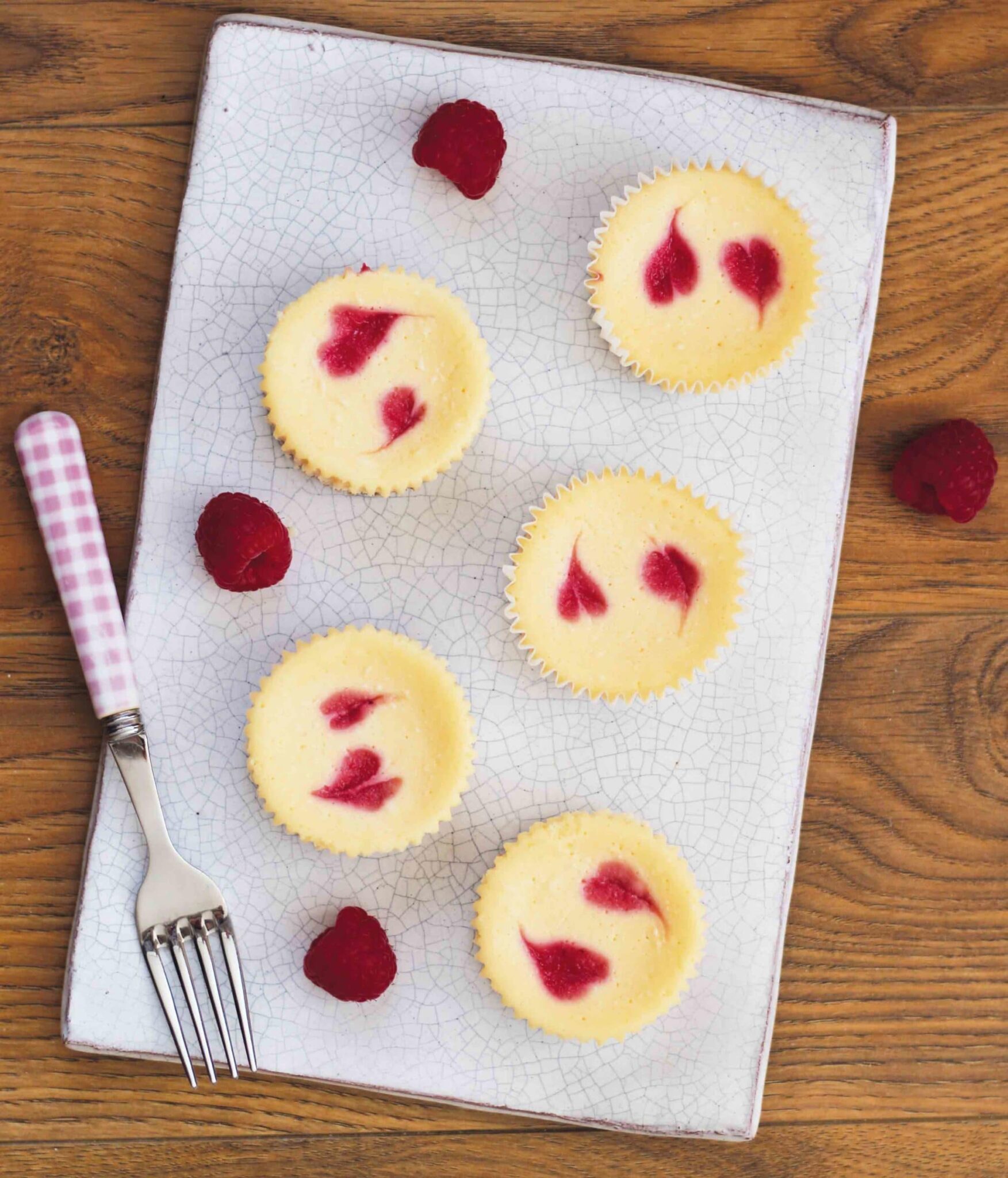 5. Étalez 3 cuillères à  soupe du mélange de fromage à  la crème sur le fond de biscuit dans les moules à  muffins. Placez 2 points de framboise sur le dessus et tirez la pointe d'un cure-dent à  travers chacun pour former un coeur.