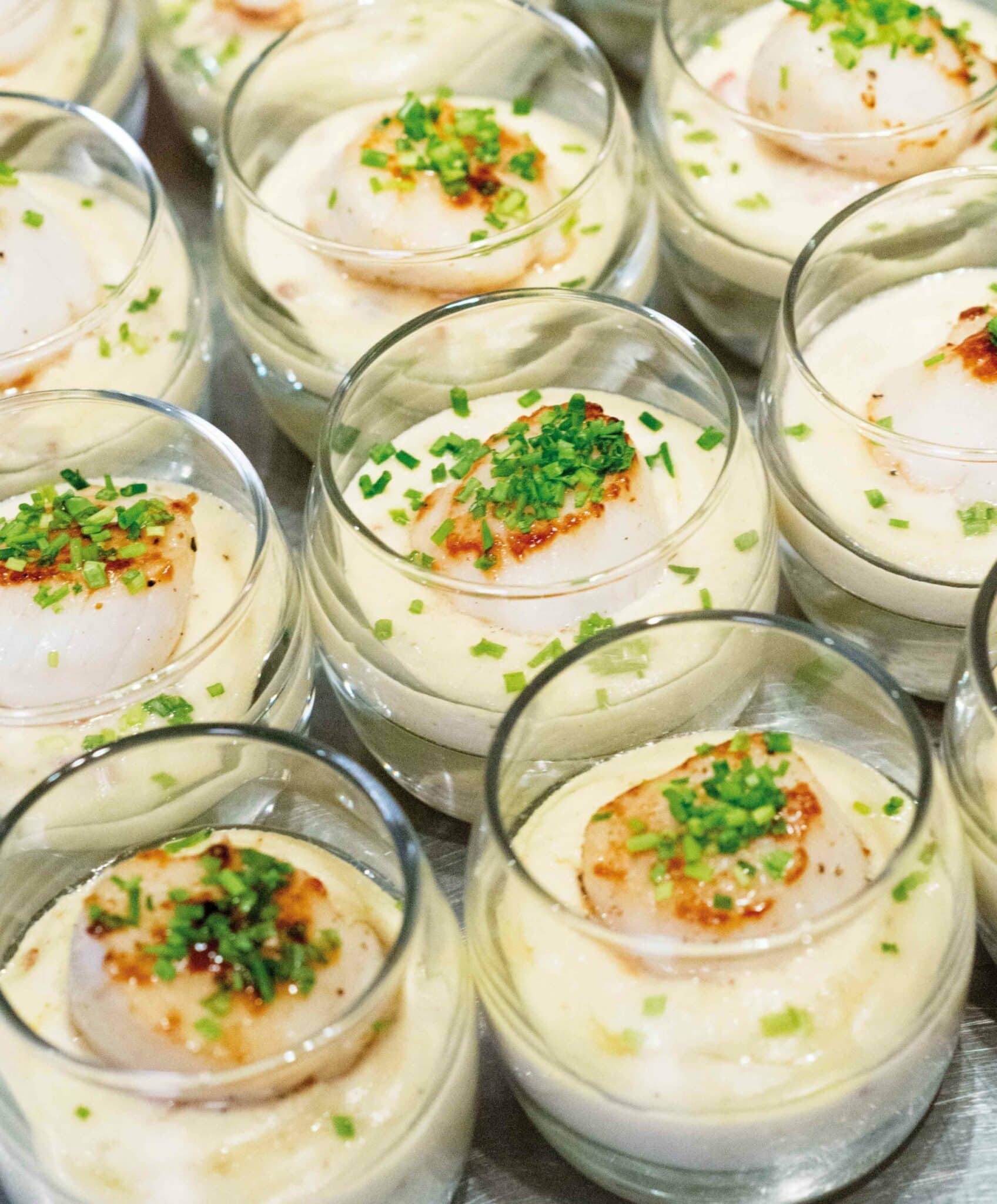 4. Étendre la sauce au bacon et à la crème sur des petits bols ou des verres, ajouter une coquille Saint-Jacques et décorer de ciboulette.