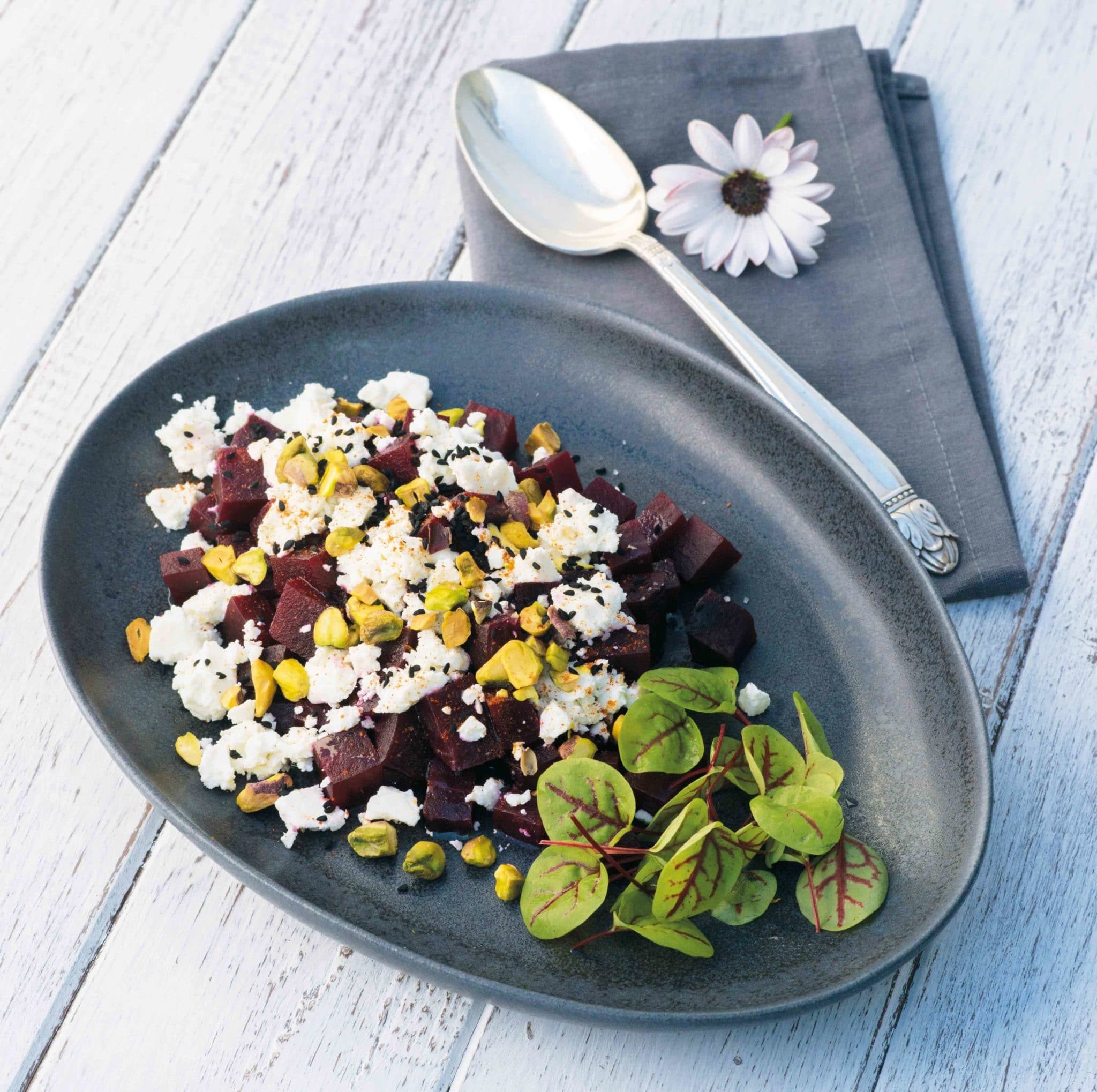 3. Émietter le fromage de chèvre sur le dessus. Mélanger le vinaigre et le paprika en poudre et en arroser le dessus. Saupoudrer de graines de cumin noir et de pistaches. Assaisonnez avec la fleur de sel et le poivre et servez avec un peu d'huile.