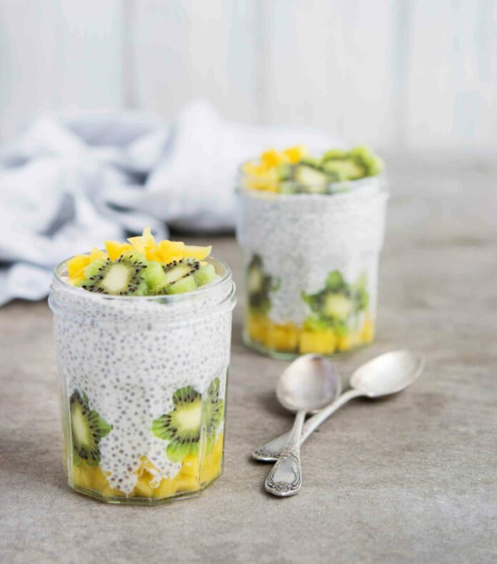 5. Juste avant de servir, répartir les morceaux de fruits entre quatre verres, recouvrir de pudding au chia et garnir de quelques morceaux de fruits. Servir immédiatement.