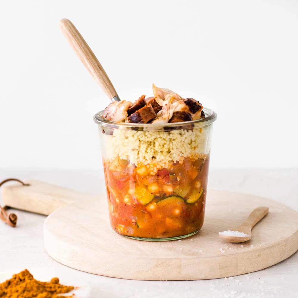 - Surmonter de couscous, puis de viande. Fermer hermétiquement et conserver au frigo pour votre lunch ou votre dîner du lendemain.