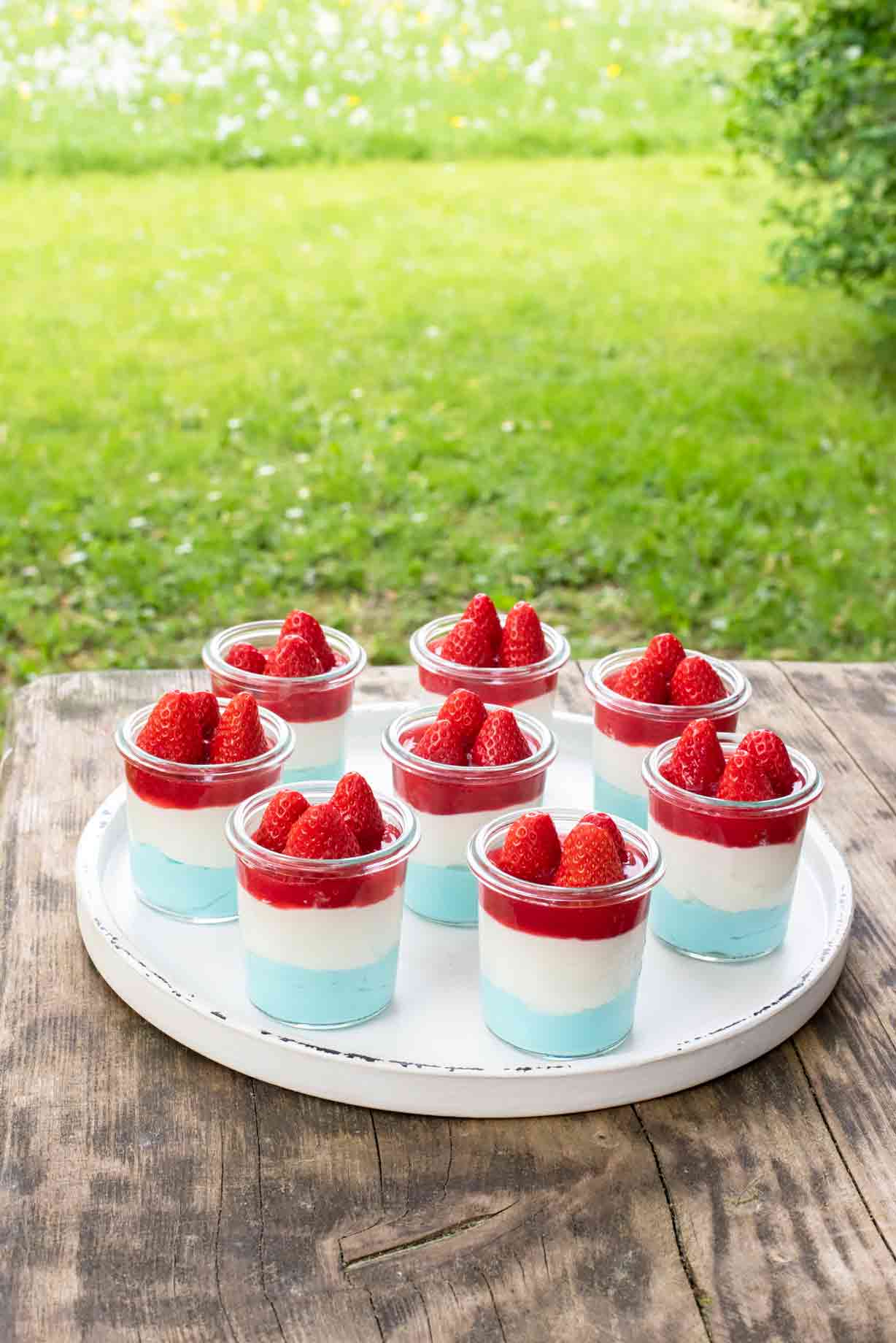 4. Ajoutez une couche de crème de mascarpone bleu dans quelques verres, recouvrez d'une couche blanche et terminez avec un peu de coulis de framboise et des fraises. Réfrigérer jusqu'au moment de servir.