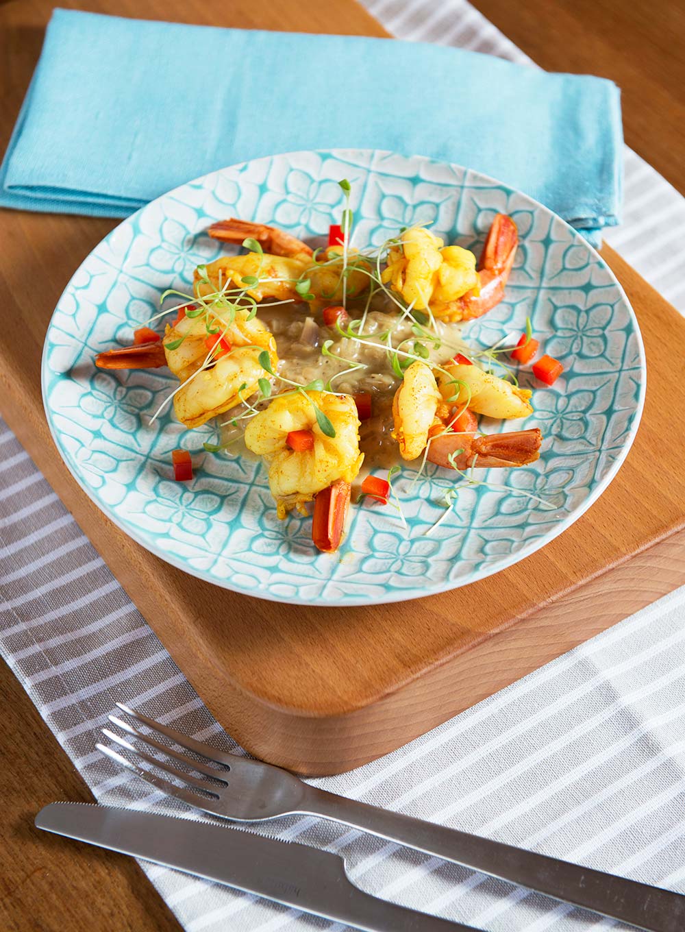 - Verser la sauce bière-beurre dans les assiettes, placer les crevettes dessus et enfin décorer avec les poivrons coupés en dés et le cresson.
