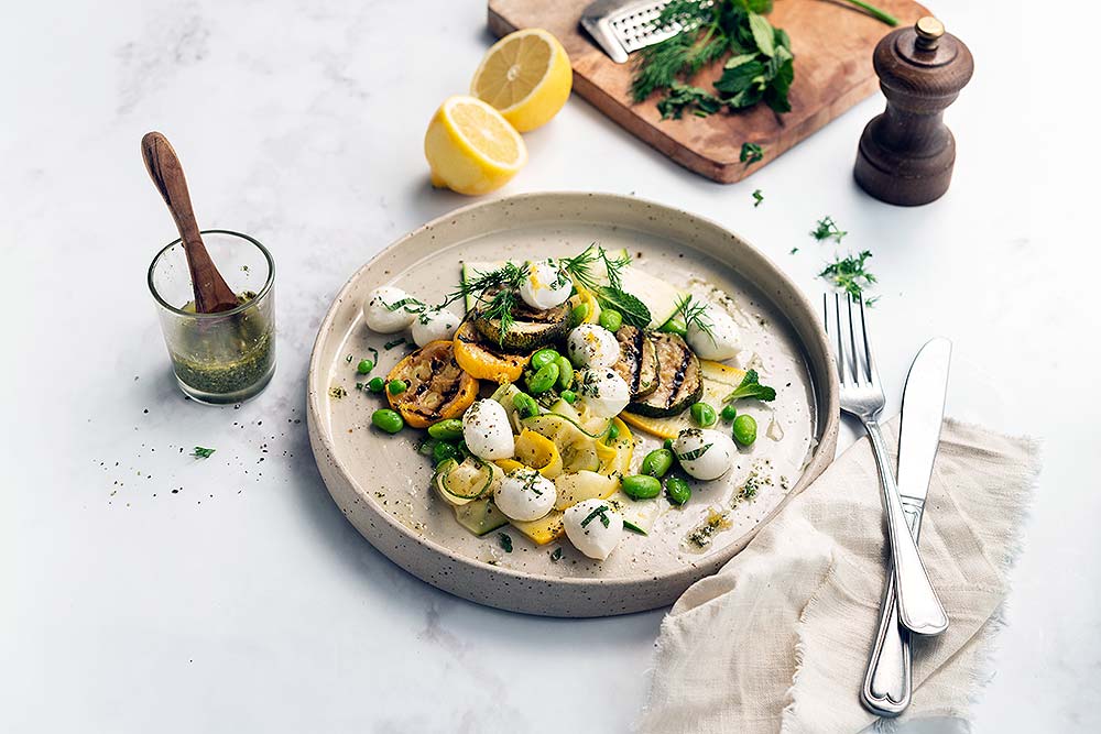Cette salade de courgettes grillées marinées, de petits pois, de fèves edamame, de menthe, d’aneth, de citron, de pesto à la roquette et de Galbani Mini Mozzarella compose un met délicieux qui vient tout droit du sud.