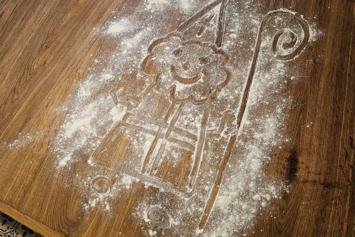 Ensuite, direction le four ! Au préalable, chacun écrit son nom sur le papier sulfurisé à côté de son Boxemännchen, afin que tout le monde puisse le retrouver après la cuisson. Avant que les enfants ne rentrent chez eux avec leurs créations, ils sont de nouveau conduits dans le salon, où une surprise très spéciale les attend : Saint-Nicolas en personne !