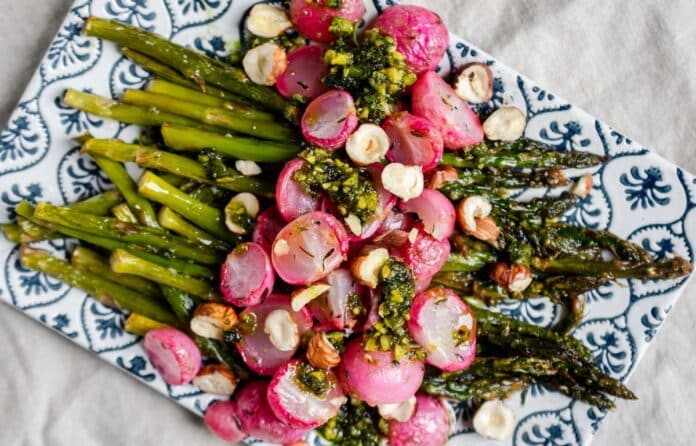 6. Placez les asperges sur un plat de service, recouvrez-les de radis grillés. Saupoudrer les noisettes grillées. Vous pouvez également terminer le plat avec quelques cuillerées de pesto.