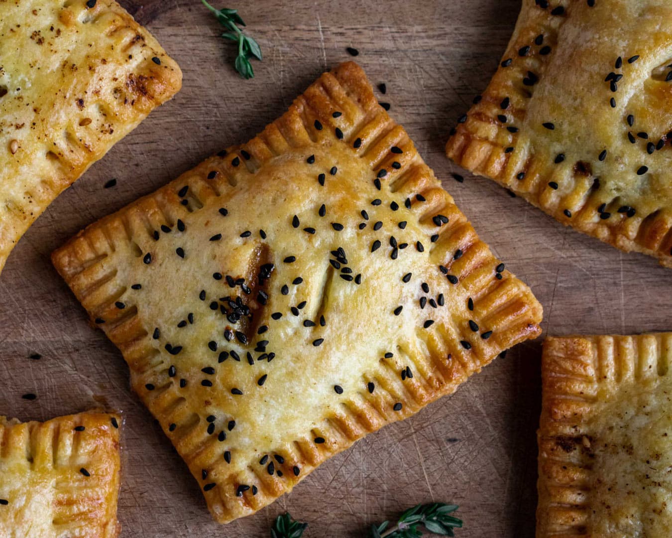 - Une fois prêt à cuire, badigeonnez le dessus et les côtés des pâtés avec la dorure, et saupoudrez-les de graines de votre choix. J'ai saupoudré certains des miens de graines de nigelle et d'autres de za'atar.