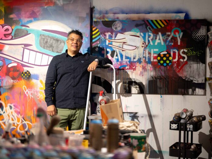 Aujourd’hui, SUMO est un nom connu, qui a ses entrées un peu partout. On rencontre le Crazy Baldhead aux quatre coins du pays, mais aussi de plus en plus souvent sur la scène internationale. Il fait même le tour du monde sur les avions Boeing de Luxair. « Je ne m’atten- dais pas à ce que ma signature fasse la même taille que le logo Luxair », se réjouit l’artiste à propos de ce qui est probablement sa plus grosse commande. Même s’il évolue dans le milieu depuis longtemps, on ne peut pas dire que SUMO soit de la vieille école. Malgré son âge mûr, il est resté jeune d’esprit : le graffeur a un flair infaillible pour repérer les tendances pile dans l’air du temps et il n’a pas peur des nouvelles technologies comme la RA ou les NFT. Pour son projet le plus récent, « Enter the Sumoverse », il a combiné son street art classique avec la 3D et des projections vidéo.